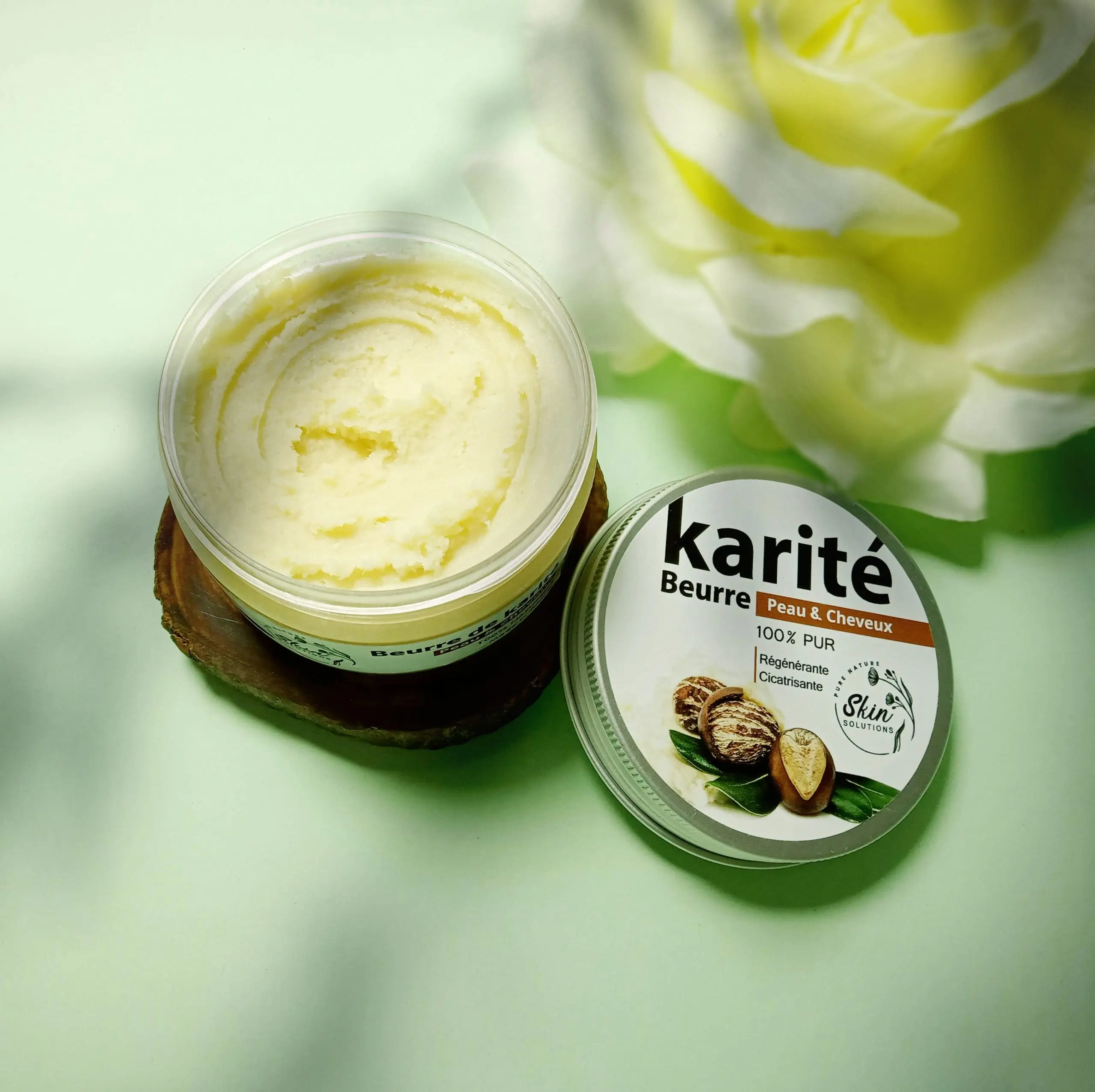 Découvrez notre Beurre de Karité 100% pur, sélectionné et transformé dans nos laboratoires Skin Solutions pour offrir le meilleur de la nature. Un soin régénérant multi-usage qui sublime peau et cheveux.